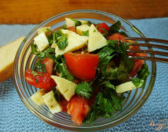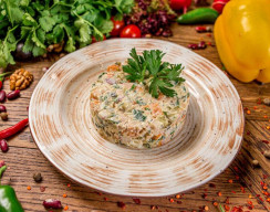 Состав: картофель, морковь, филе куриное, огурцы маринованные, огурцы свежие, горошек консерв, яйцо куриное отварное, майонез, зелень, соль.